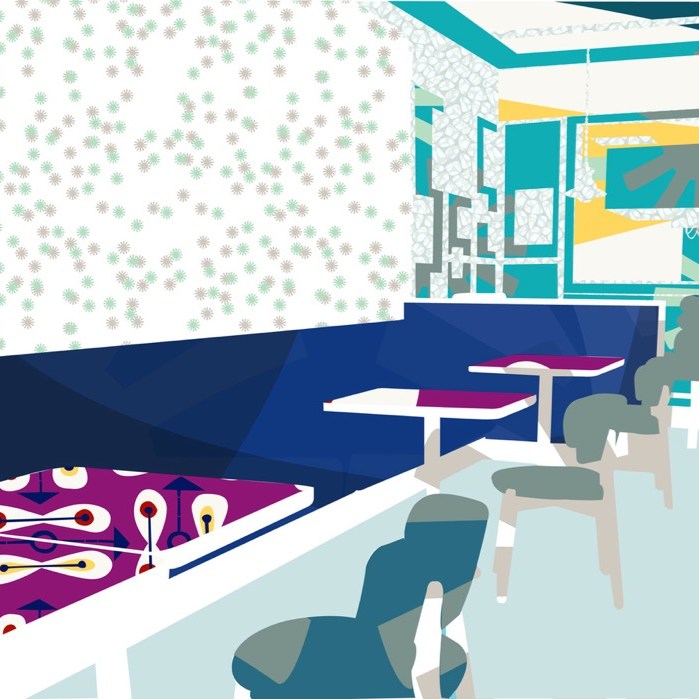 I have a passion for pattern and colour. In my illustration works I combine these elements with depictions of interior and exterior architectural spaces.