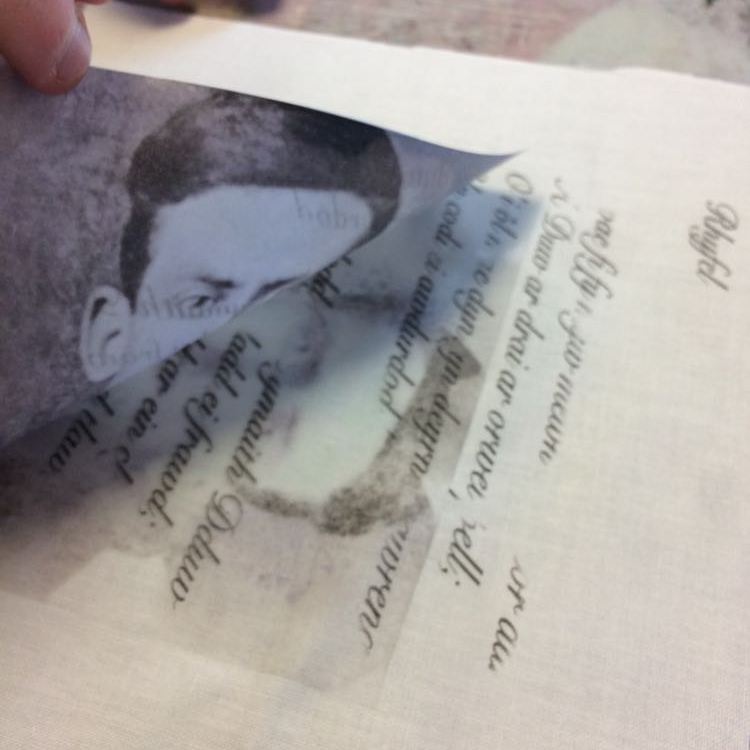 Adhesive transfer works by gluing the image face down to the substrate then wetting the back and carefully rubbing away the paper. This will work with a wide range of printed imagery except for inkjet prints. These are water-soluble and therefore cannot be dampened. Photocopies or laser prints are ideal for this because the image occupies the top surface of the paper making it easier to separate. Adhesive transfer will take to most surfaces including wood, fabric, card, paper and stone. The surface to be transferred to needs to be robust enough to withstand gluing, wetting and rubbing!