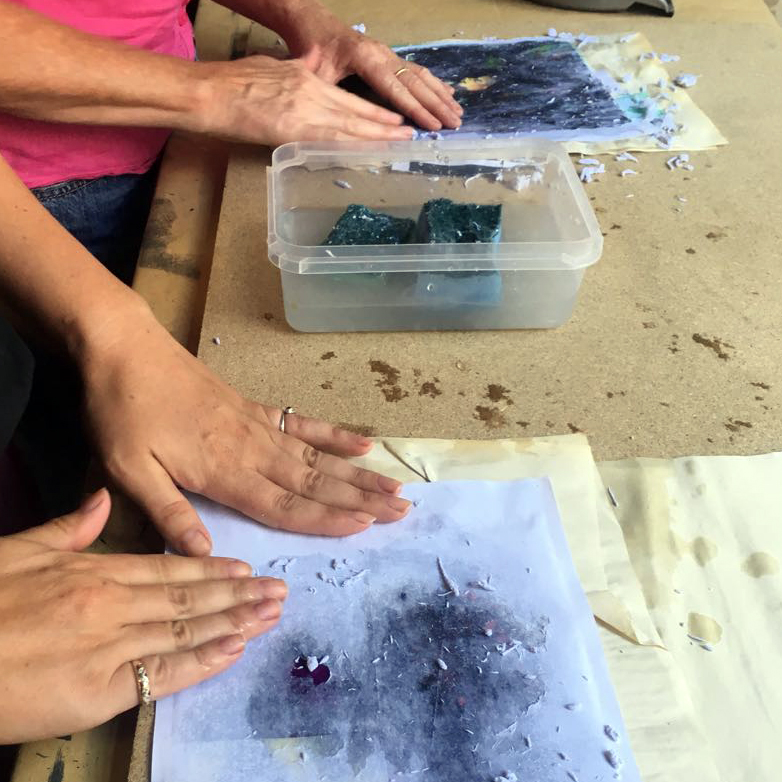 As the water in the acrylic soaks into the paper the transfer image paper will stretch and ruffle. The first few minutes of sticking should therefore be devoted to ensuring that the two surfaces stick properly to each other.