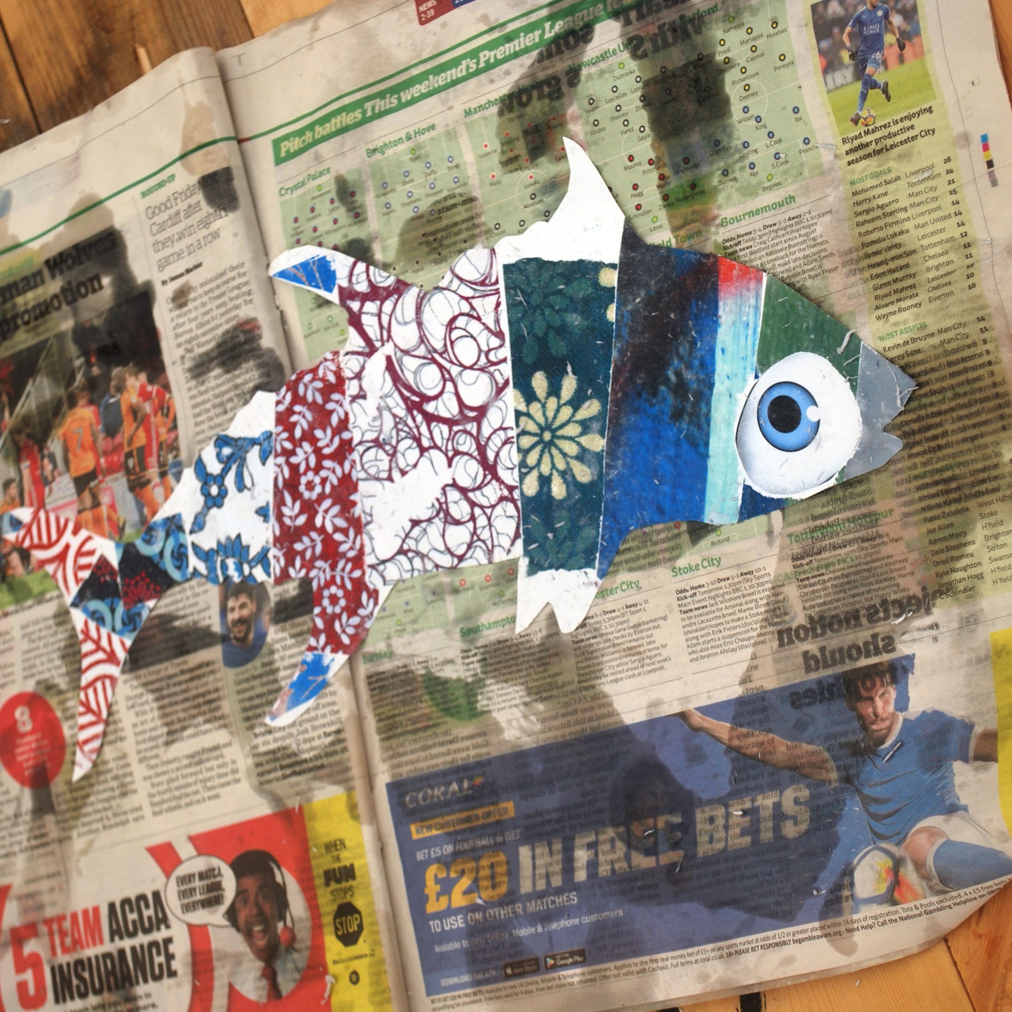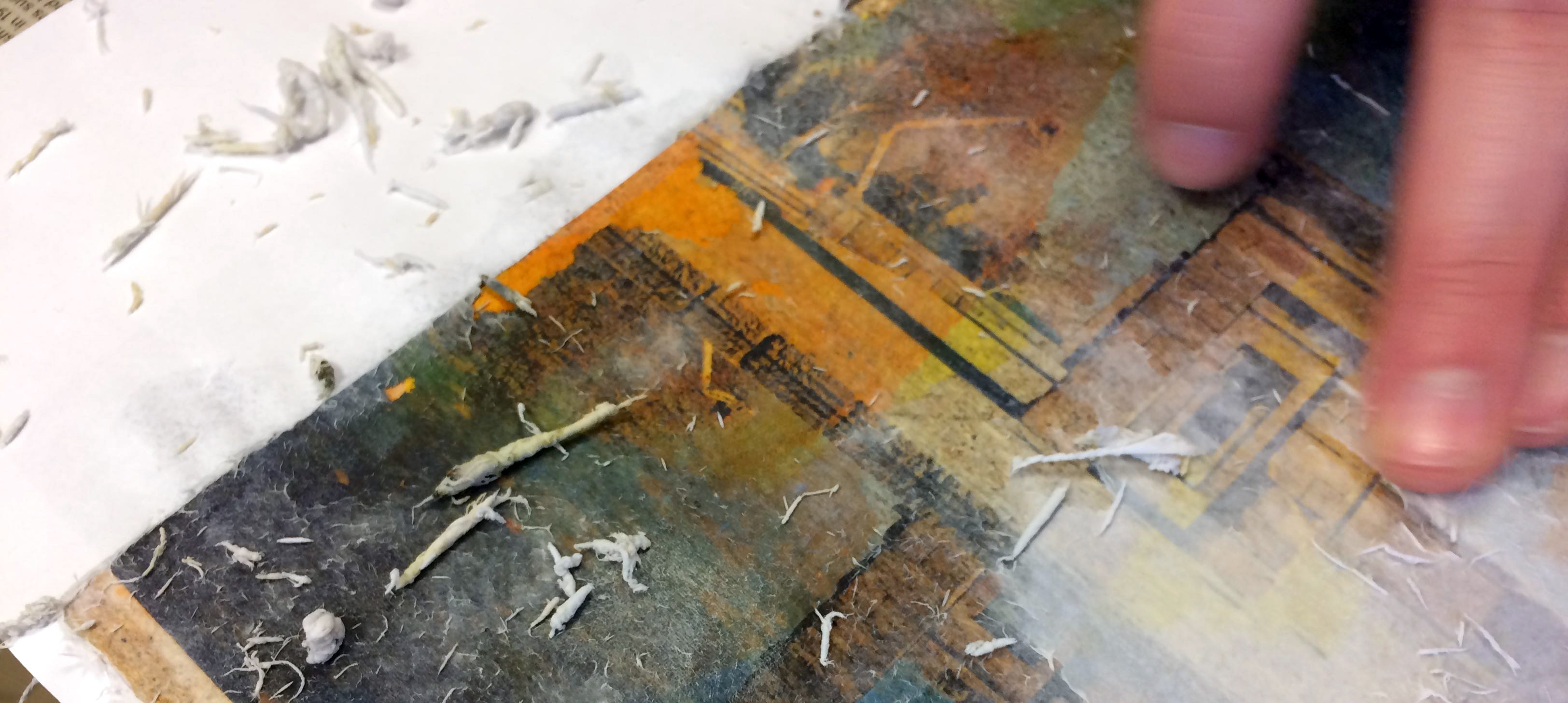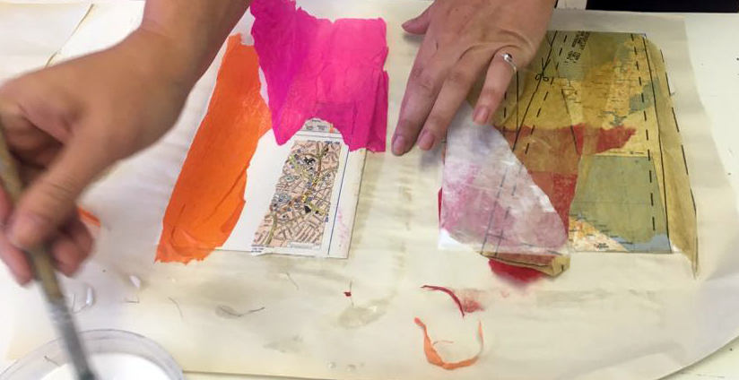 Apply a collage background using the acrylic varnish to stick down thin papers or tissue.