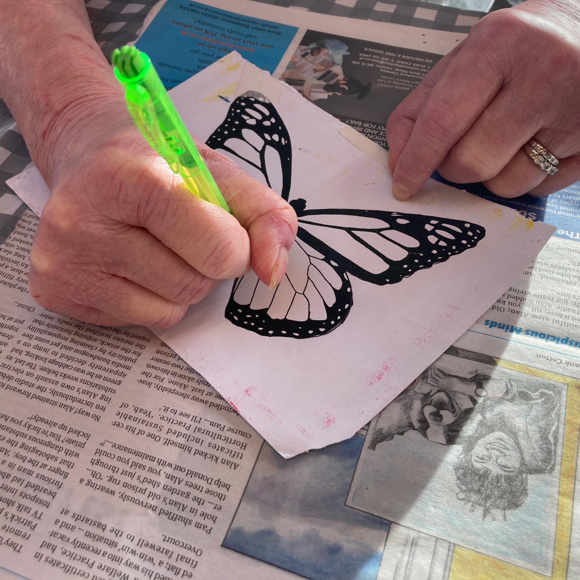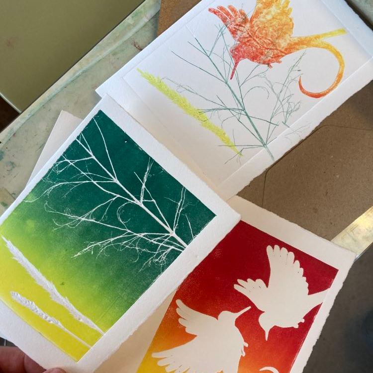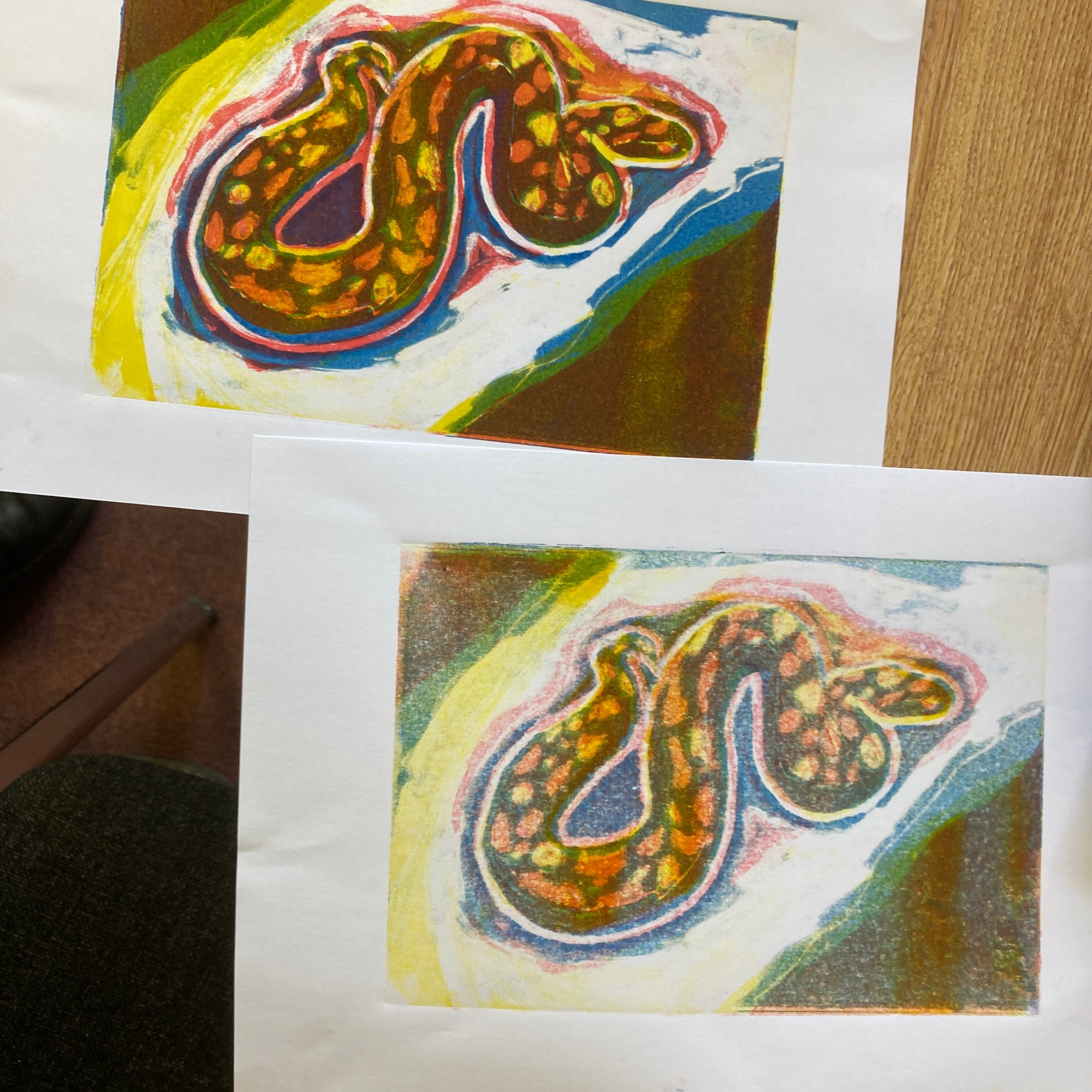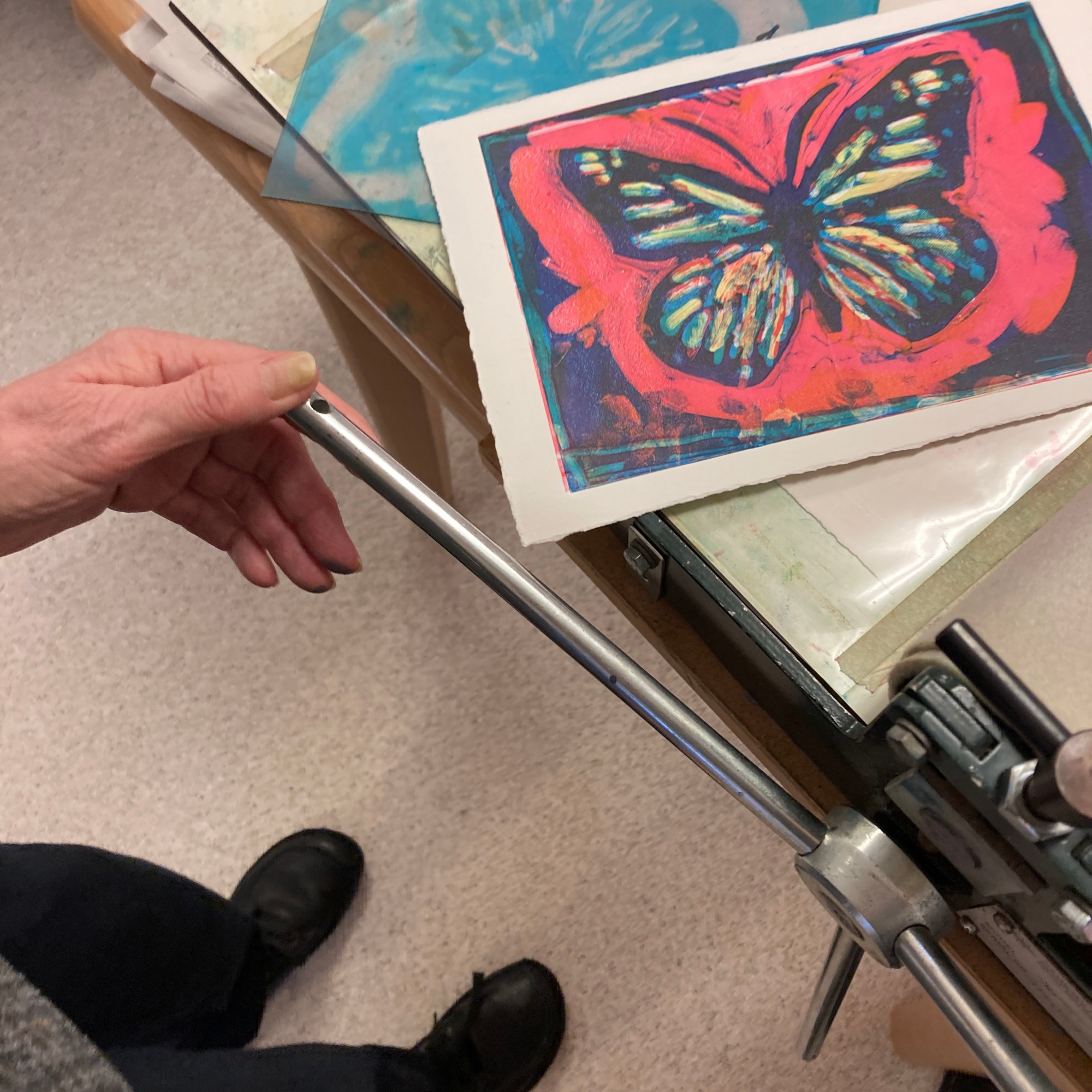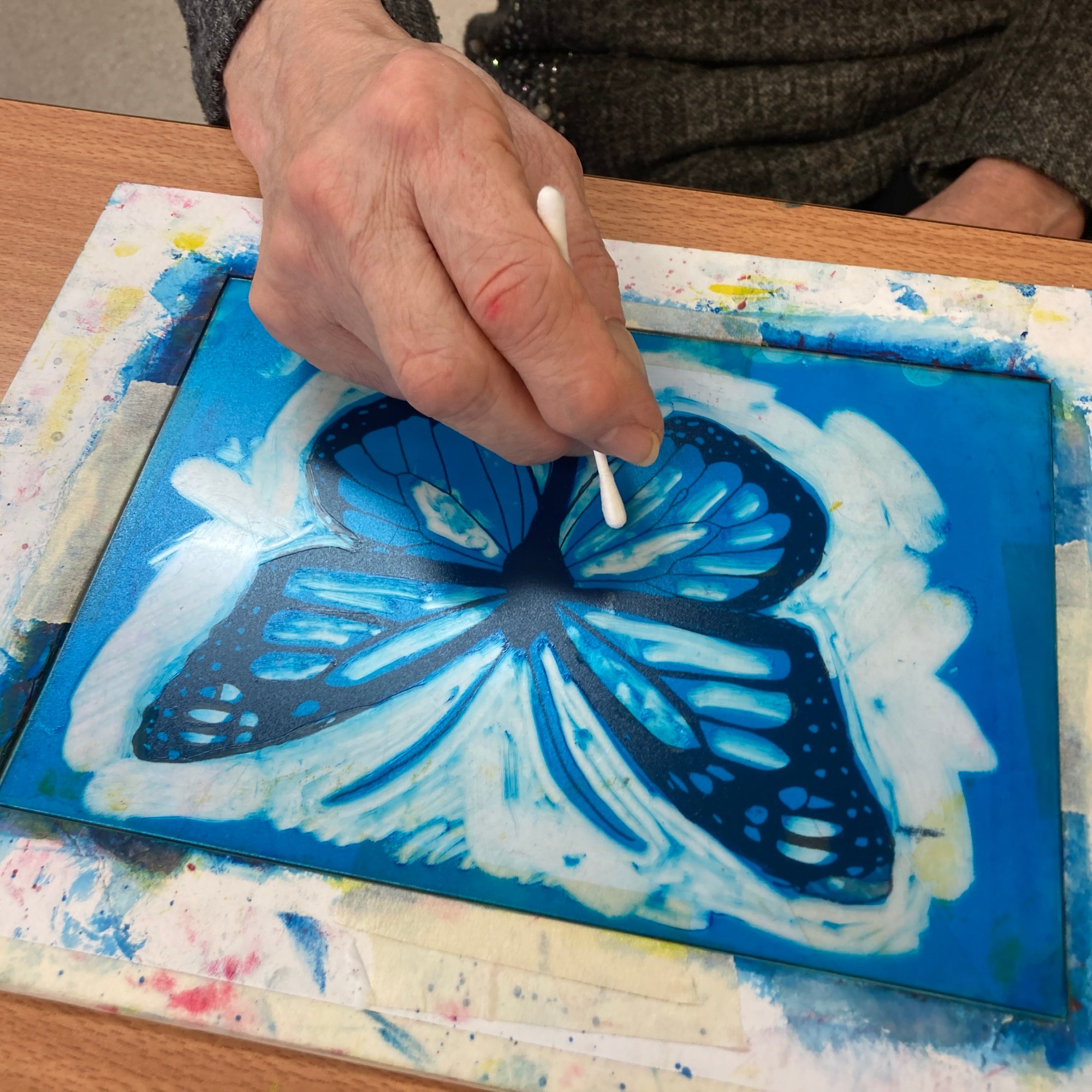 I work with Inside Out Cymru providing regular arts and crafts sessions centering on printmaking activities for groups interested in mindful creativity. I have also worked with dementia patients in hospital (Ysbyty’r Tri Chwm, Ebbw Vale) and people with early onset dementia in the community. I also work regularly with Horatio’s Garden at Llandough Hospital in Cardiff providing arts workshops for long term patients in the spinal injury ward.
