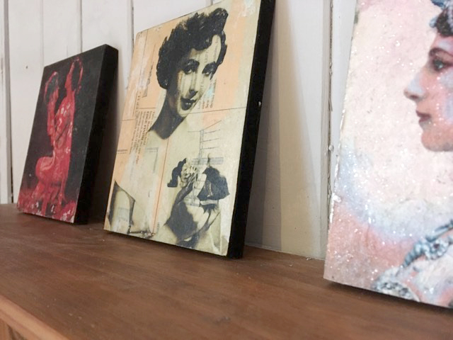 These prints are made using tissue paper, sewing pattern, wrapping paper and photocopy transfer. They are 12 cms x 15 cms and mounted on 12mm MDF.